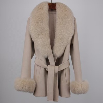 2025 caliente nueva moda con cordones Midi cuello de piel de zorro y mangas abrigo de lana de doble cara para mujeres